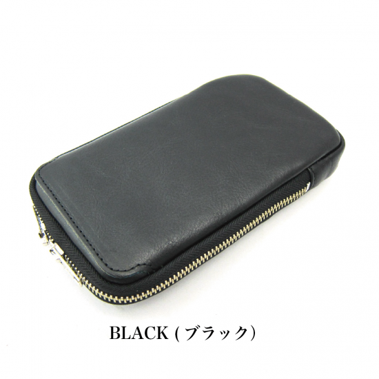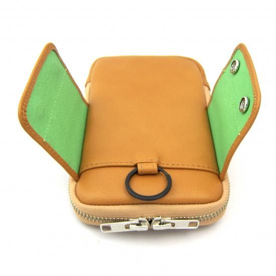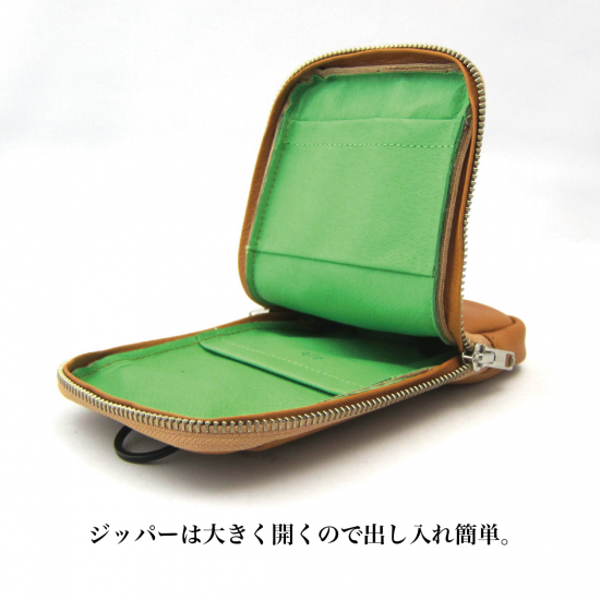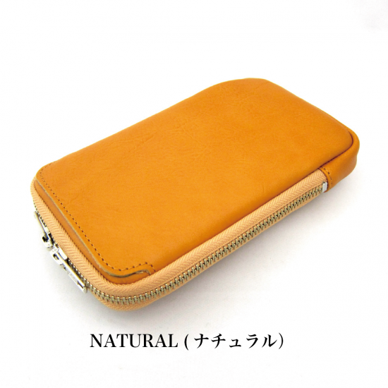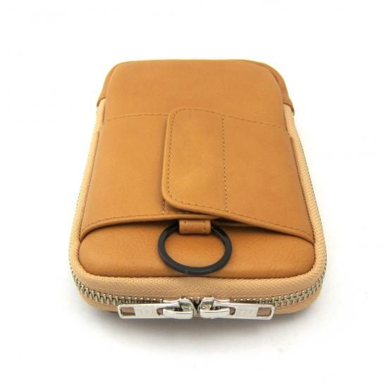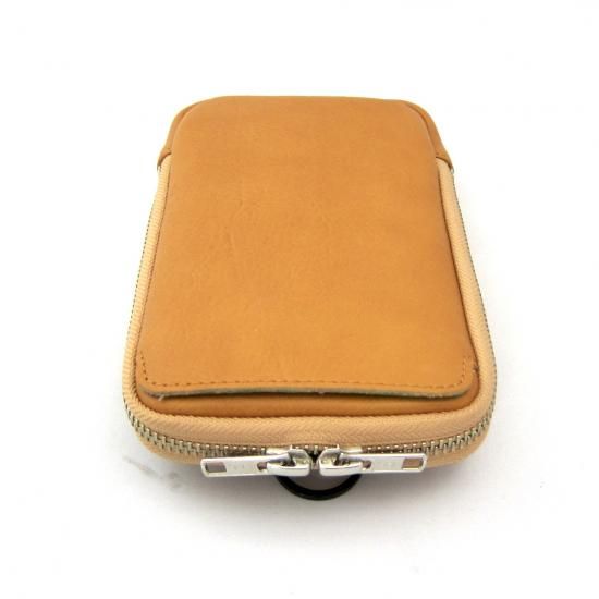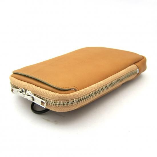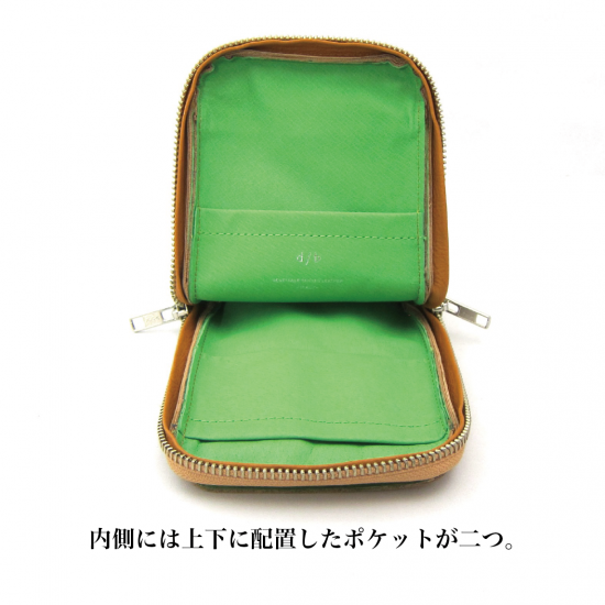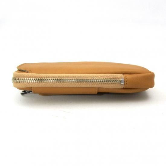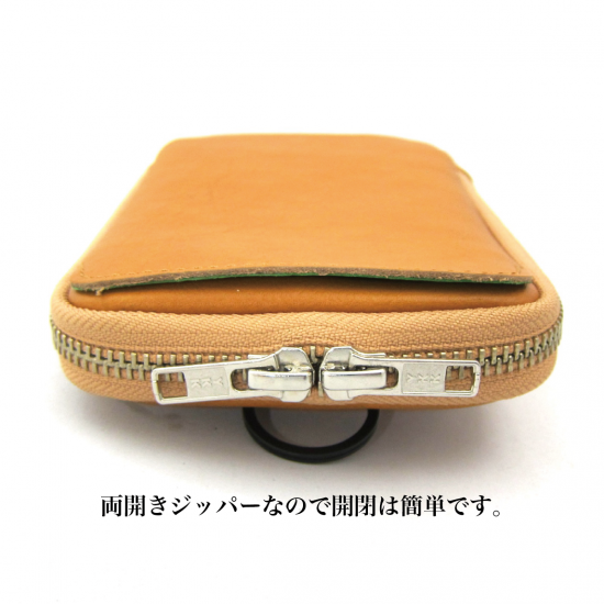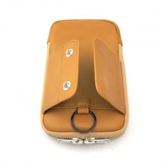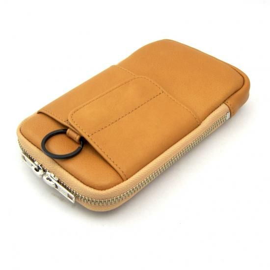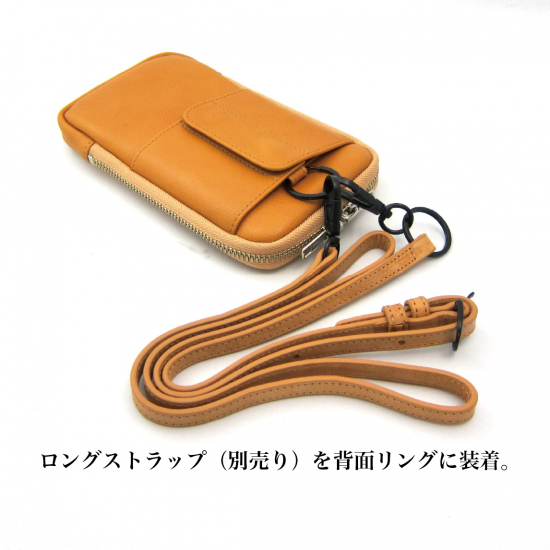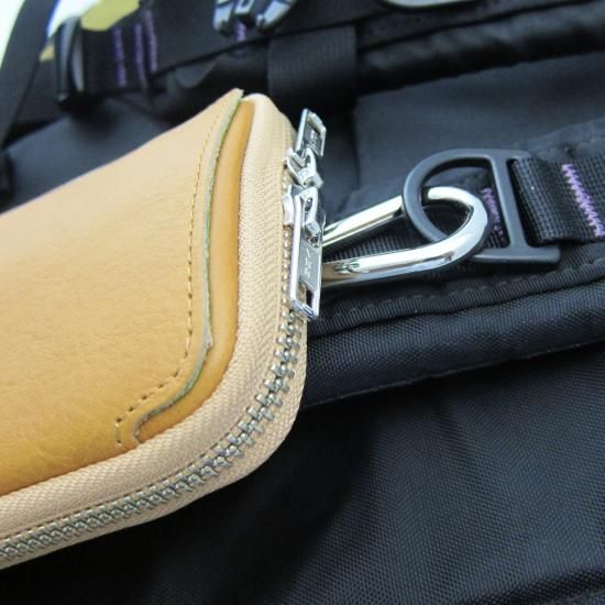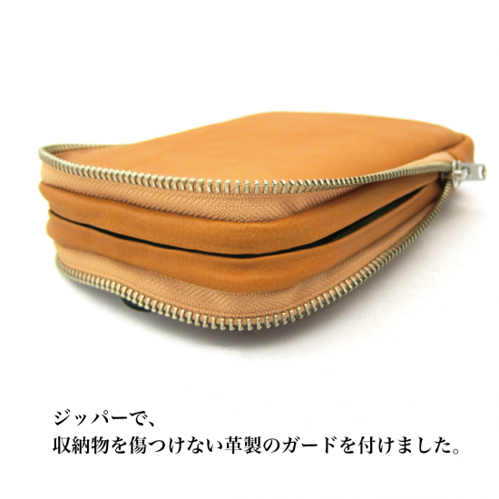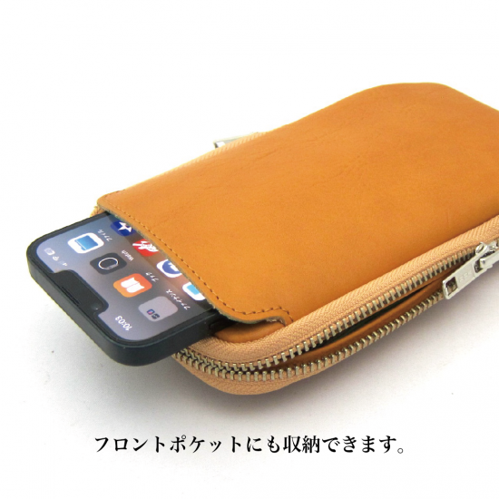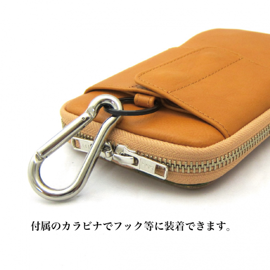 多機能なマルチポーチです。スマートフォン(iPhone17 ProMax 収納可)、タバコ、カメラ、メガネなどいろんな物を収納して携帯できます。リュックやバッグのベルトに巻き付ける革製のフラップや、付属のカラビナを装着できる丸リングを背面に付けたので、いろんな場所に取り付けできます。また収納物を傷つけないように、ジッパー内側をガードする革を付けました。またインナーには上下にポケットを配置。素材は、外側にイタリア・サンタクローチェ地方のタンナー:アテナ社のバケッタレザー: